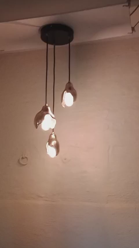 The chandelier is made up of three shades. The total height is 77cm. The diameter of the ceiling cup is 20cm. The width of the chandelier is 34cm. Each individual shade is 13cm x 12cm x 7cm. The lighting components are also made in South Africa to the highest standards, including the lightbulbs.