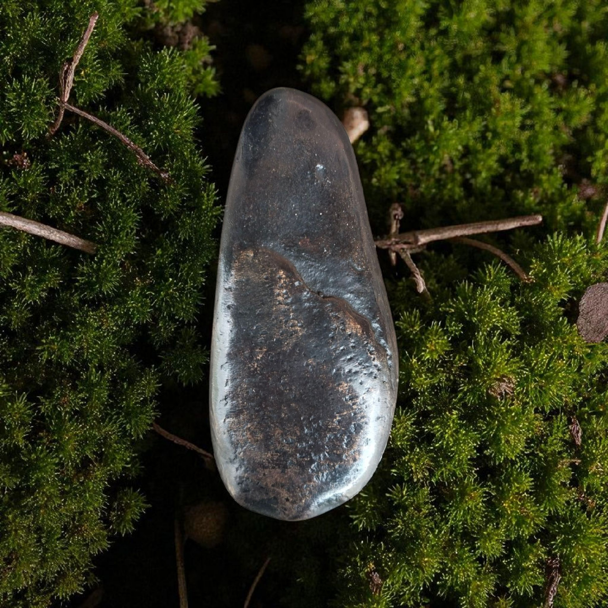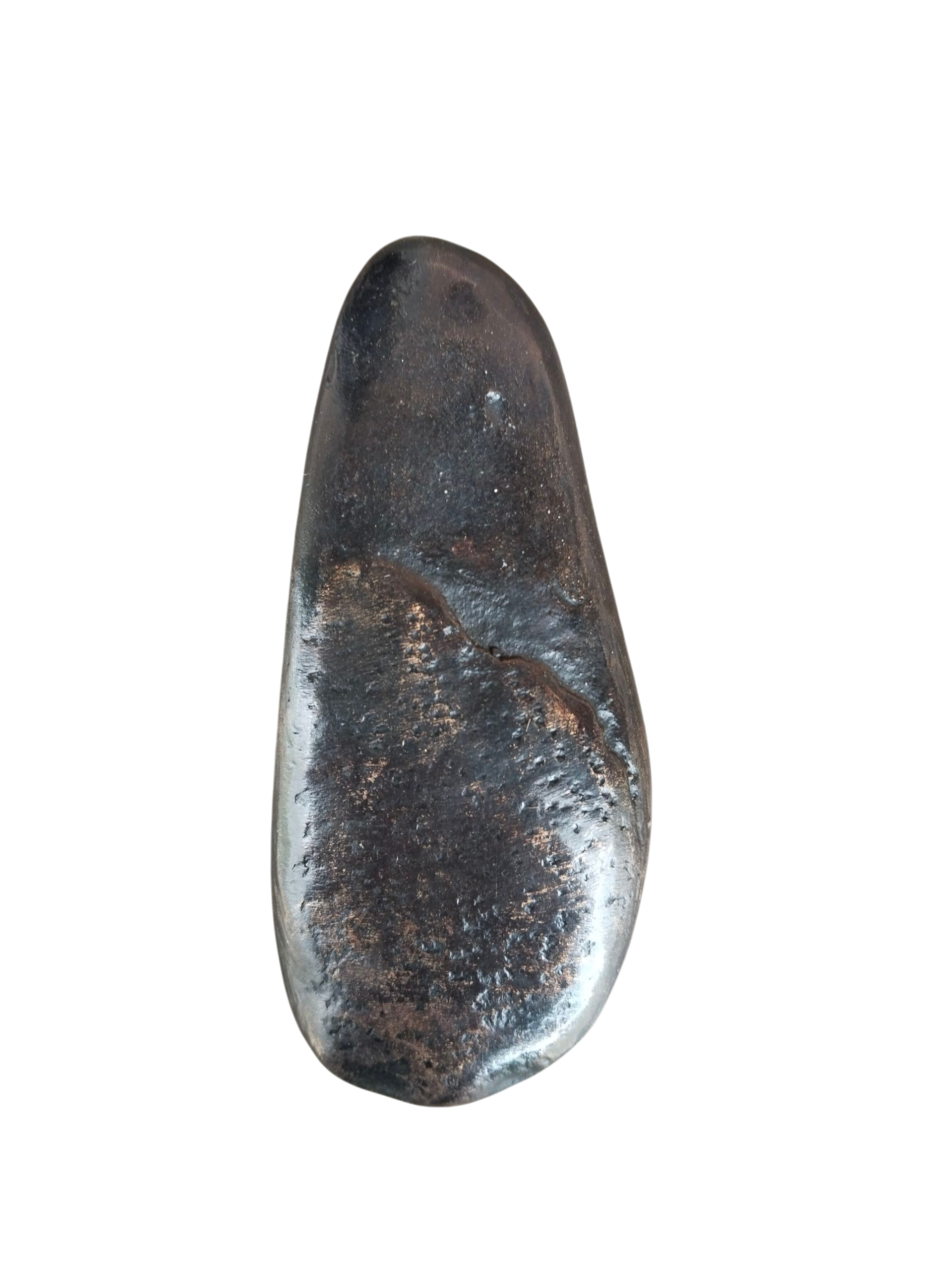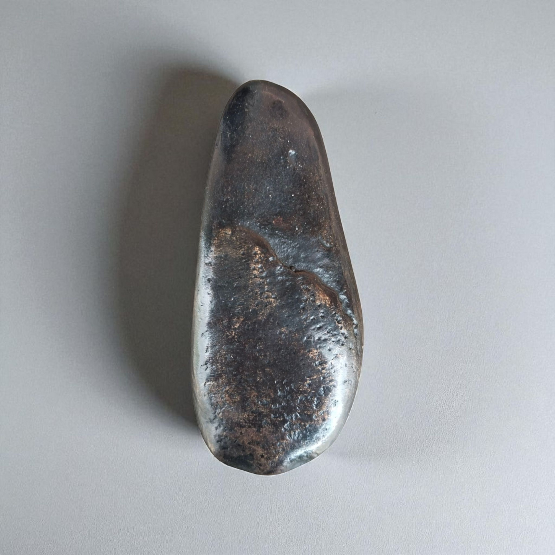 The Stream Pull was created using a stone gathered from a streambed. It is smooth to the touch with a lightly-textured surface. It has the depth and presence of water frothing and sparking in the sunlight. It can be used as a cupboard pull, a drawer handle, or a wall hook.